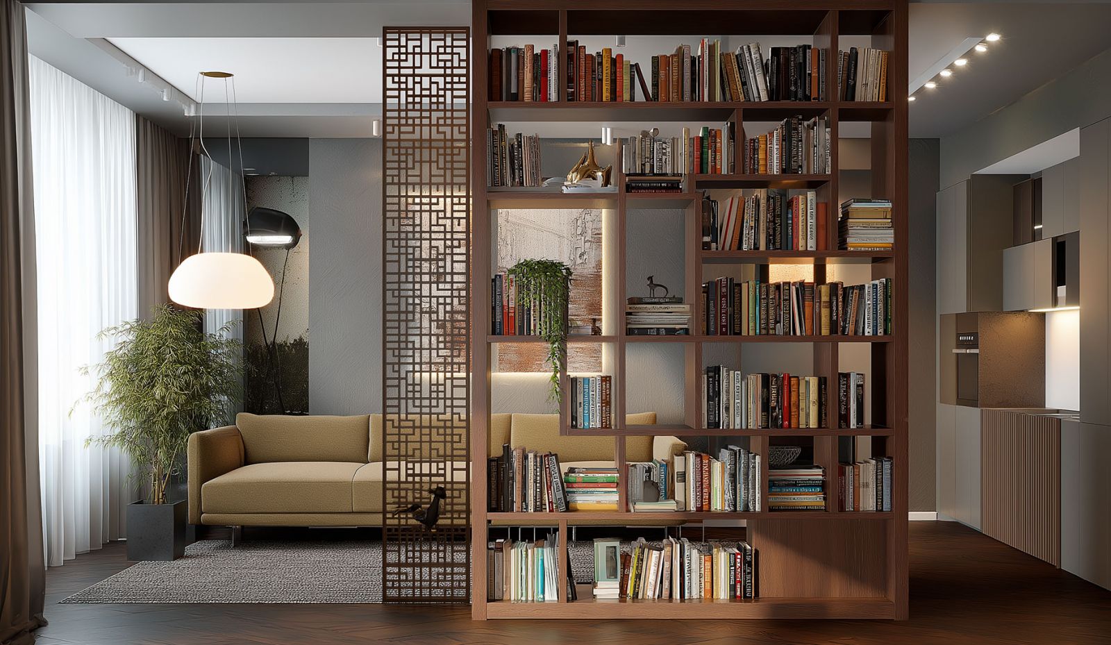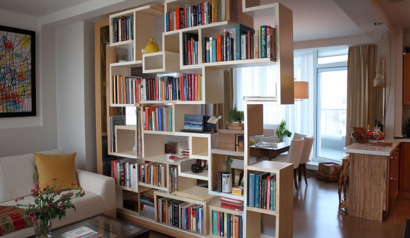 Как же это удобно! Хотите поработать в тишине? Пожалуйста - книжные полки создадут уютную атмосферу и визуально отделят рабочую зону от остальной комнаты. Желаете уединиться с хорошей книгой? Просто выберите себе местечко в этой импровизированной библиотеке и наслаждайтесь чтением, отгородившись от суеты.