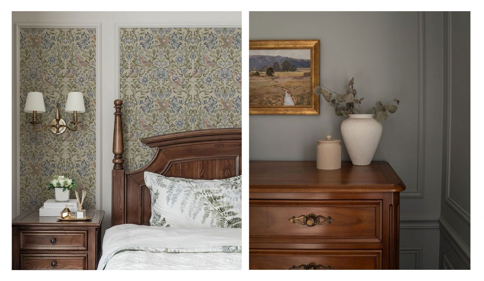 Как правило, стены в переходном стиле являются лёгким ненавязчивым фоном. Из материалов предпочтение отдаётся фактурной штукатурке, декоративному кирпичу с эффектом натуральной кладки, деревянным панелям. Чтобы привнести ту самую индивидуальность и изюминку в переходный интерьер, отличным выбором станут обои с лёгким ненавязчивым сюжетом. Гармоничные цветовые вариации, дизайнерские сюжеты на любую тематику (будь то классические узоры и вензеля или та же имитация природных текстур) позволят создать оригинальный акцент на определённой зоне вашего пространства, наполнят его смыслом и оригинальностью. К тому же, они максимально экологичны, подходят для размещения в спальнях и детских комнатах.